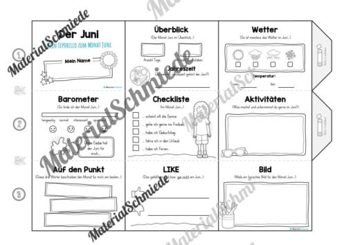 Um das kleine Heftchen zum Juni zu erhalten, müssen die Schüler dieses zunächst an den dafür vorgesehenen Linien zerschneiden, richtig zusammenkleben und anschließend ausfüllen.