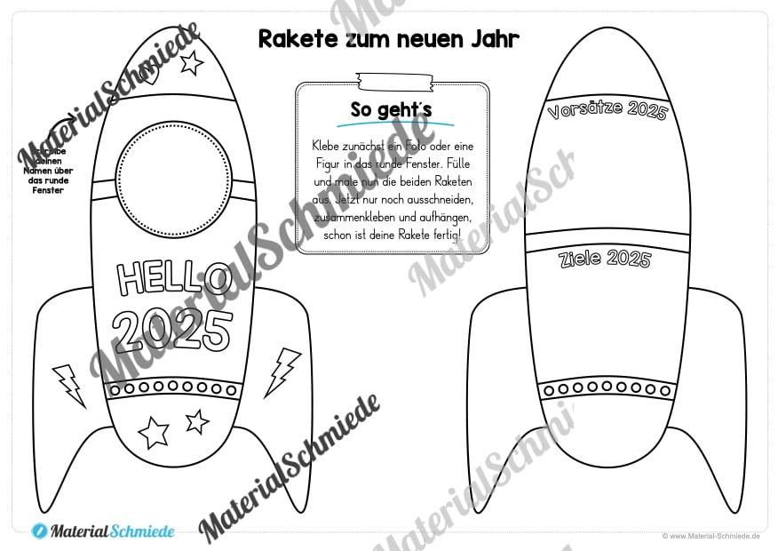 Hier findet ihr eine Bastelübung mit Raketen zum neuen Jahr 2025.