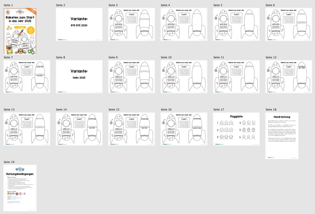 Bei der Version 1 steht auf der Vorderseite „BYE BYE 2024“, bei der Version 2 „HELLO 2025“. Für die Rückseiten stehen verschiedene Varianten zur Auswahl. So findet ihr hier eine Blanko-Vorlage, eine Vorlage, in dem die Schüler Wünsche und Ziele eintragen sollen und noch mehrere weitere Versionen.