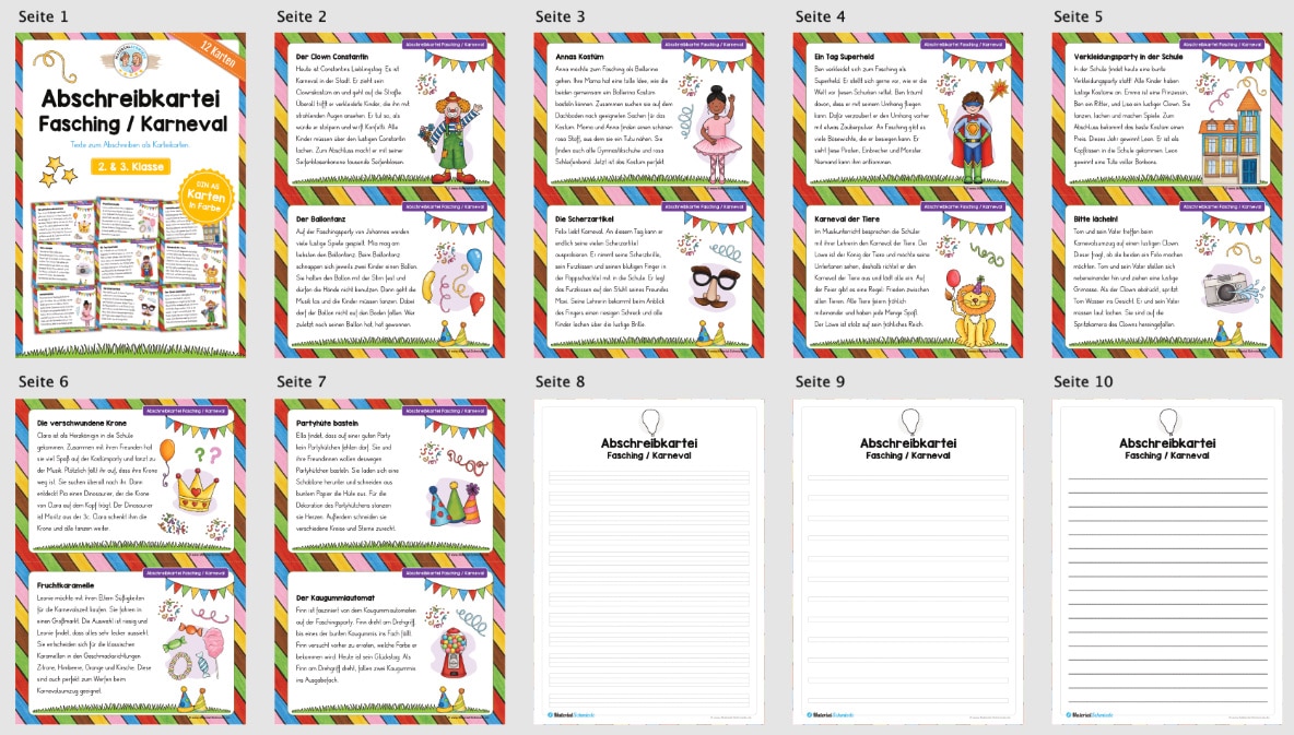 Hier findet ihr 12 Abschreibkarten zum Thema Fasching/Karneval für die 2. und 3. Klasse.