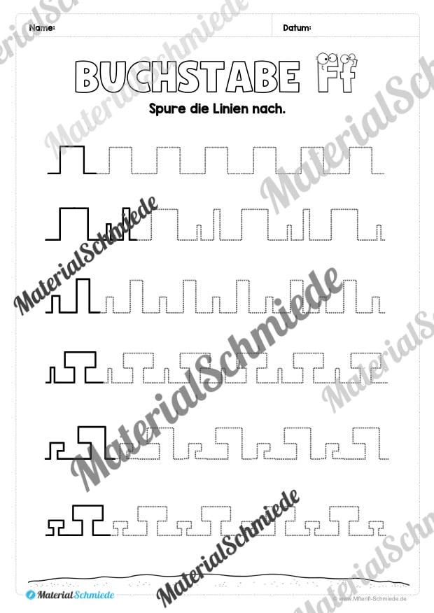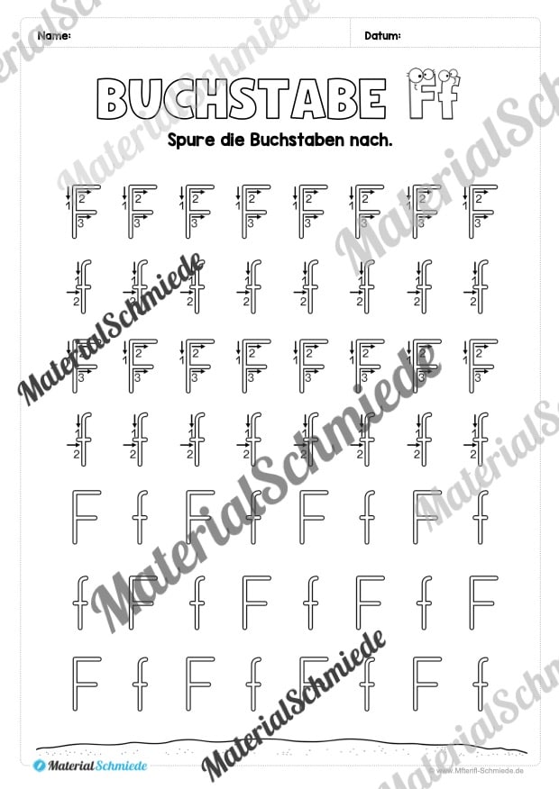 Fokus in diesem Materialpaket liegt auf dem Nachspuren des Buchstaben F. Den Schülern werden die genauen Schwünge gezeigt, wobei diese Informationen nach und nach weniger werden (da die Lernkurve bei den Kindern steigt):