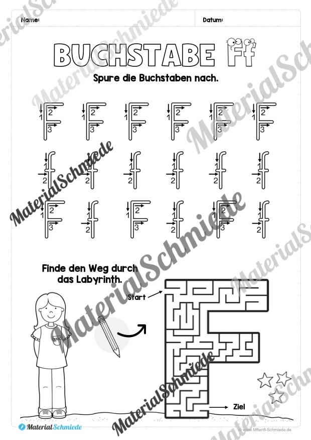 Damit die Kinder in der 1. und 2. Klasse das Buchstaben schreiben lernen, bedarf es ständiger Wiederholung. Aus diesem Grund haben wir 25 verschiedene Arbeitsblätter erstellt, mit denen die Schüler das Schreiben lernen speziell des Buchstabens F und f üben können.