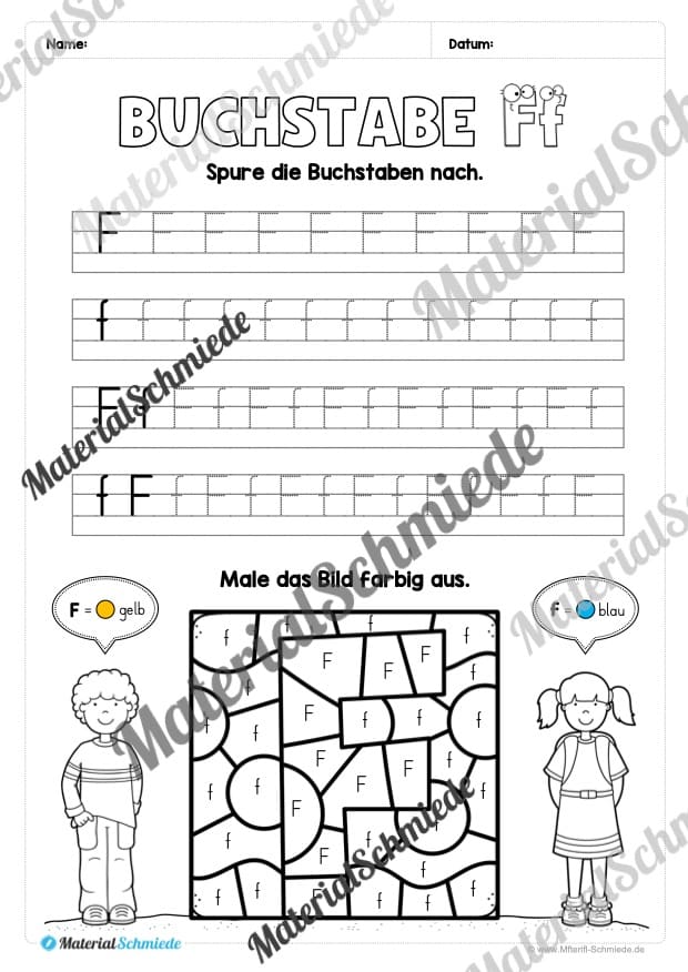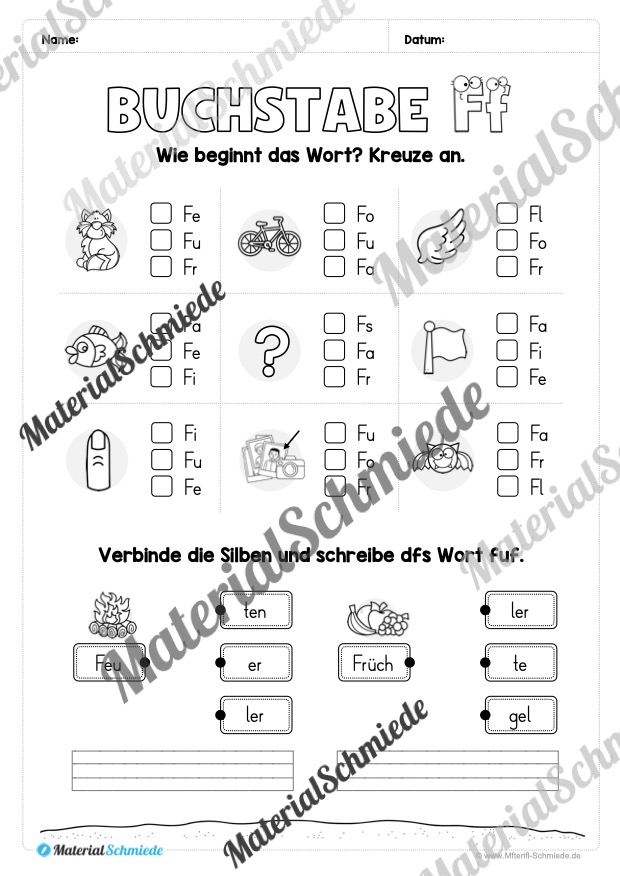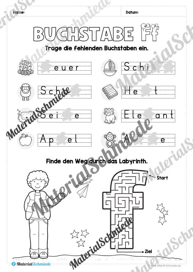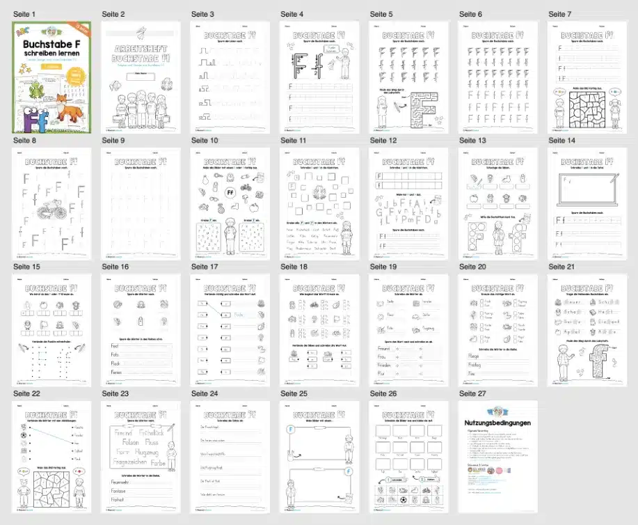 Dieses Arbeitsheft beinhaltet 25 Arbeitsblätter zum Buchstaben F / f.