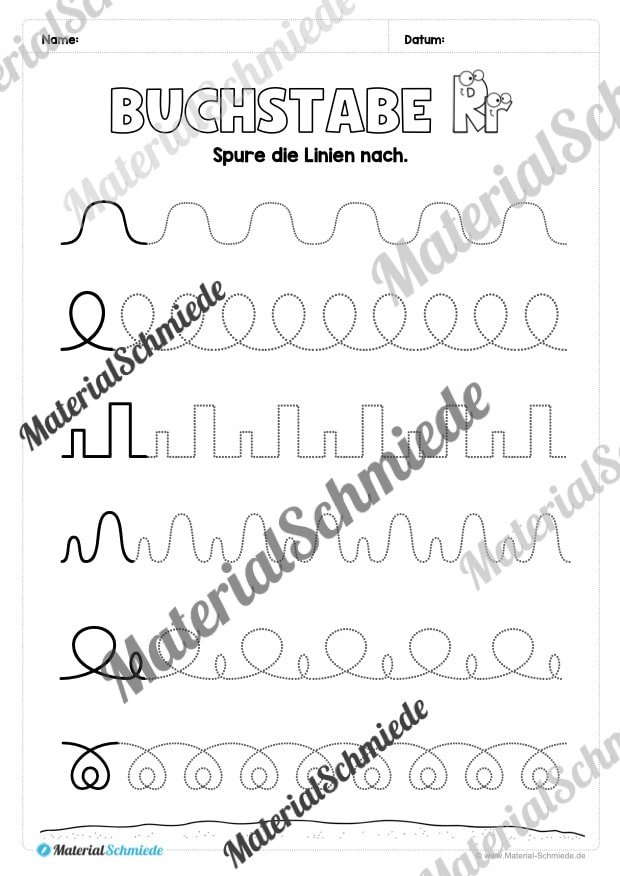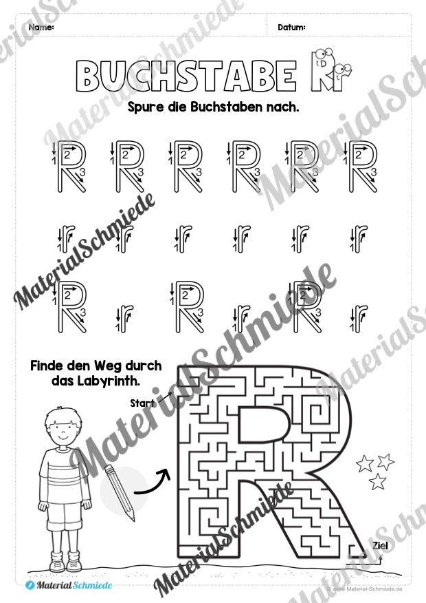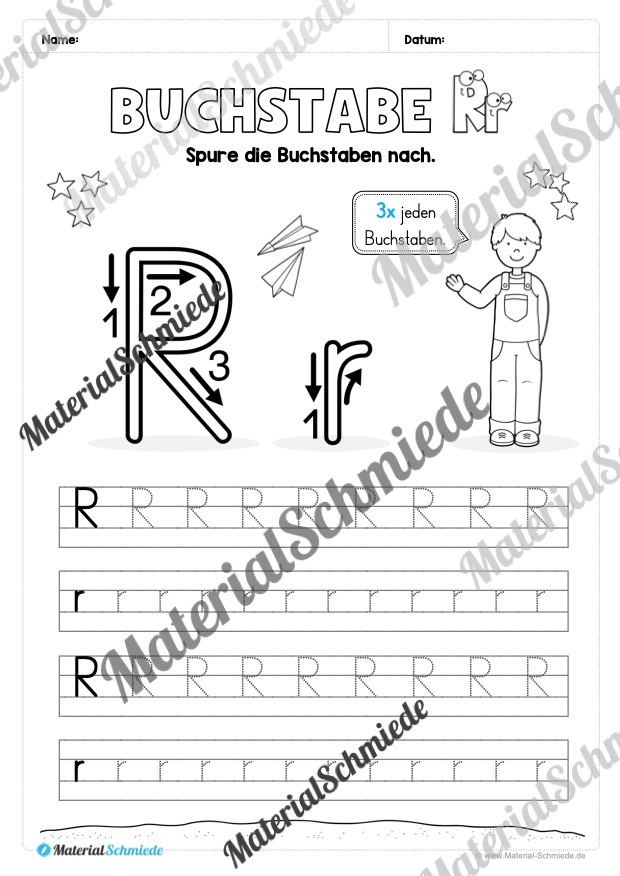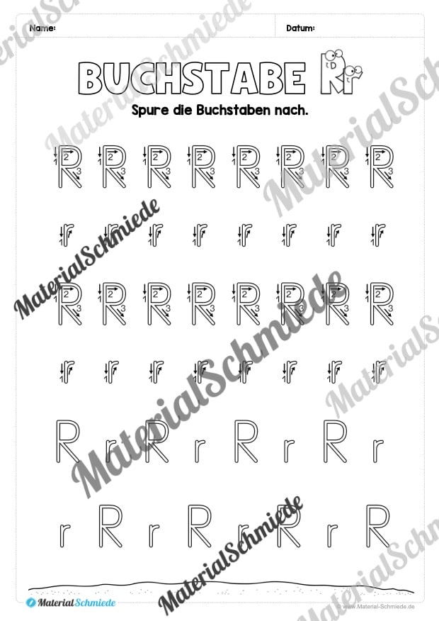 Fokus in diesem Materialpaket liegt auf dem Nachspuren des Buchstaben R. Den Schülern werden die genauen Schwünge gezeigt, wobei diese Informationen nach und nach weniger werden (da die Lernkurve bei den Kindern steigt):