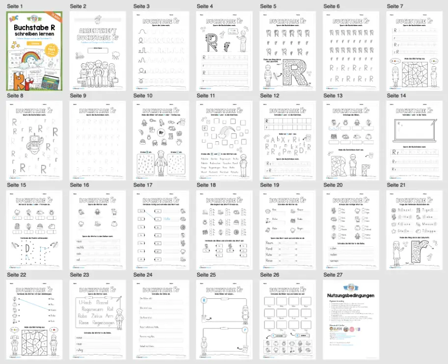 Damit die Kinder in der 1. und 2. Klasse das Buchstaben schreiben lernen, bedarf es ständiger Wiederholung. Aus diesem Grund haben wir 25 verschiedene Arbeitsblätter erstellt, mit denen die Schüler das Schreiben lernen speziell des Buchstabens R und r üben können.
