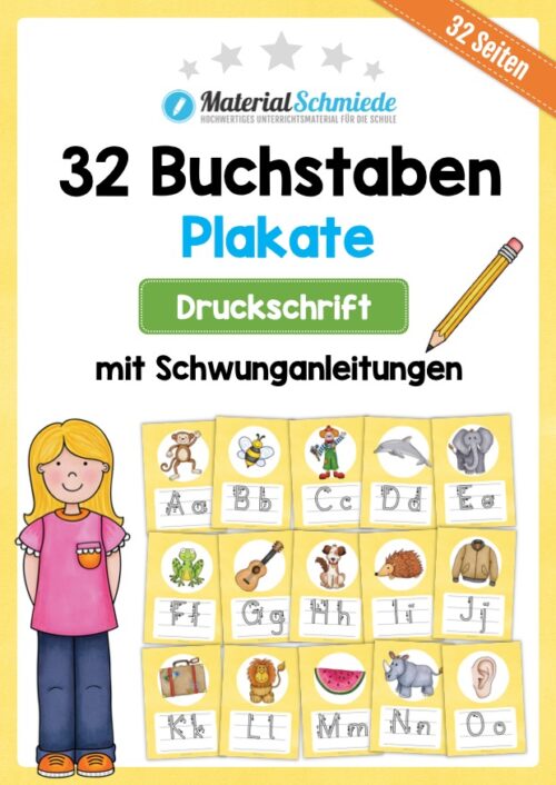 Hier findet ihr insgesamt 32 Buchstabenplakate in Druckschrift mit Schwunganleitungen.