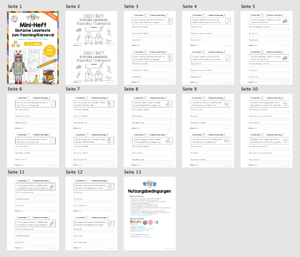 Hier findet ihr ein Mini-Heft mit Lesetexten und Fragen zum Fasching/Karneval für die 1. & 2. Klasse, welches insgesamt 10 Seiten enthält.