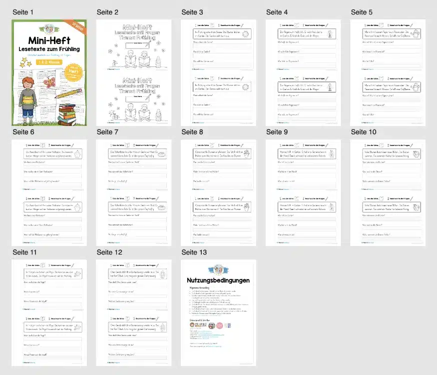 Hier findet ihr ein Mini-Heft mit Lesetexten und Fragen zum Frühling für die 1. & 2. Klasse, welches insgesamt 10 Seiten enthält.