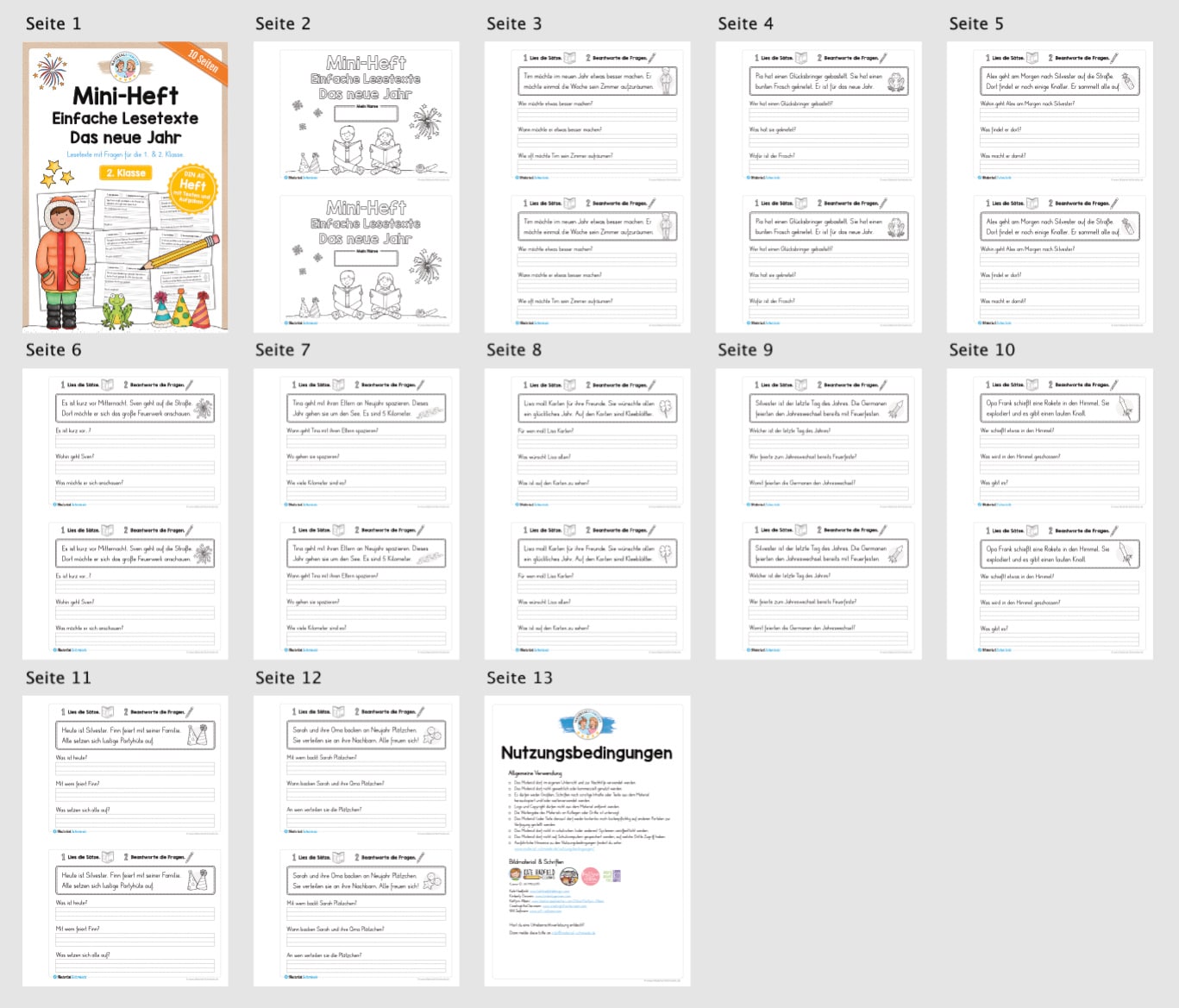 Hier findet ihr ein Mini-Heft mit Lesetexten und Fragen zum neuen Jahr für die 1. & 2. Klasse, welches insgesamt 10 Seiten enthält.