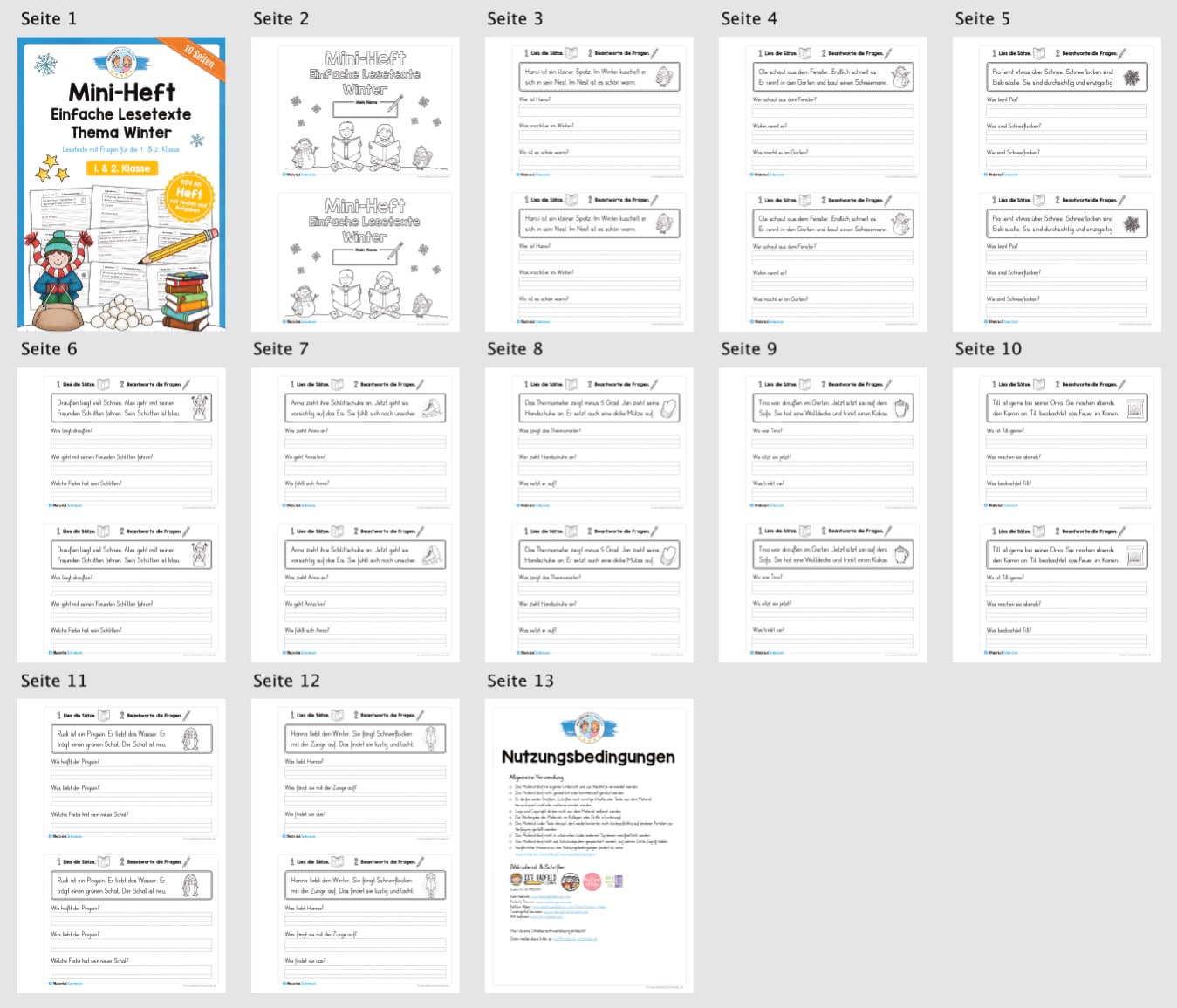 Hier findet ihr ein Mini-Heft mit Lesetexten und Fragen zum Winter für die 1. & 2. Klasse, welches insgesamt 10 Seiten enthält.