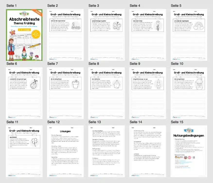 Hier findet ihr 10 Arbeitsblätter zur Groß- und Kleinschreibung mit einer Übung zum Abschreiben zum Thema Frühling für die 2. Klasse im Deutschunterricht.