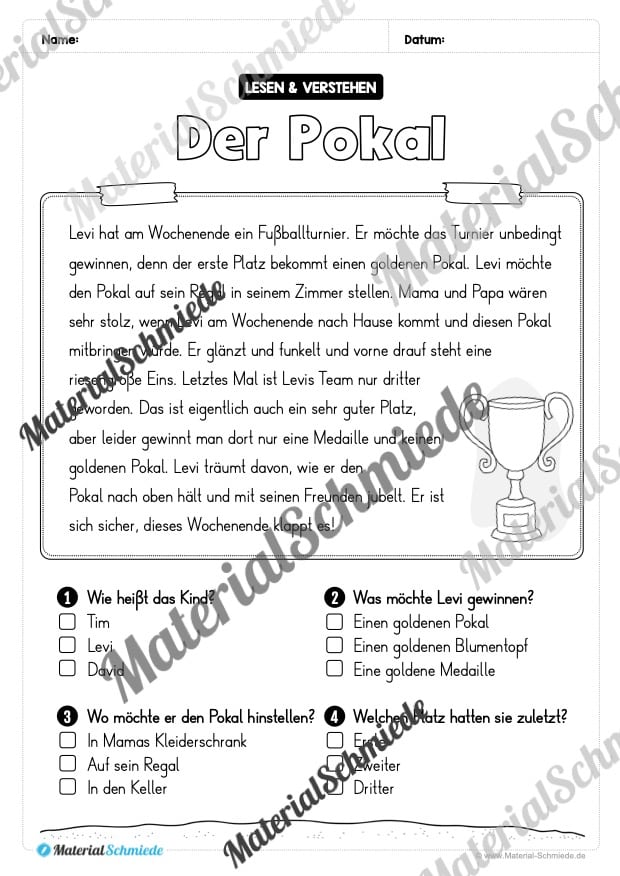 Die Schüler sollen sich den Text auf jedem Übungsblatt zunächst durchlesen. Anschließend folgen 4 Fragen, welche durch ankreuzen beantwortet werden sollen. Die Schüler müssen somit den Text inhaltlich verstanden haben, um die korrekten Antworten geben zu können. So wird das Leseverständnis geschult.