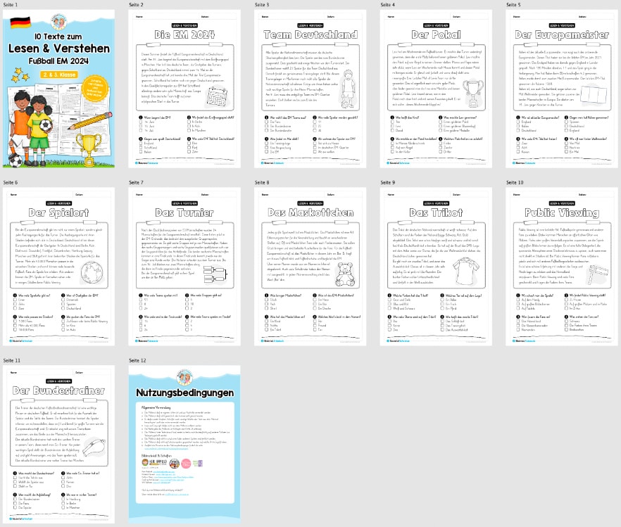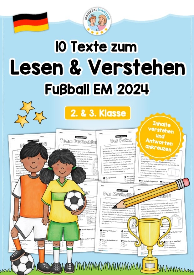 Hier findet ihr 10 Arbeitsblätter zum Lesen und Verstehen zum Thema Fußball EM 2024 mit Aufgaben zum Ankreuzen für die 2. Klasse und 3. Klasse im Deutschunterricht.