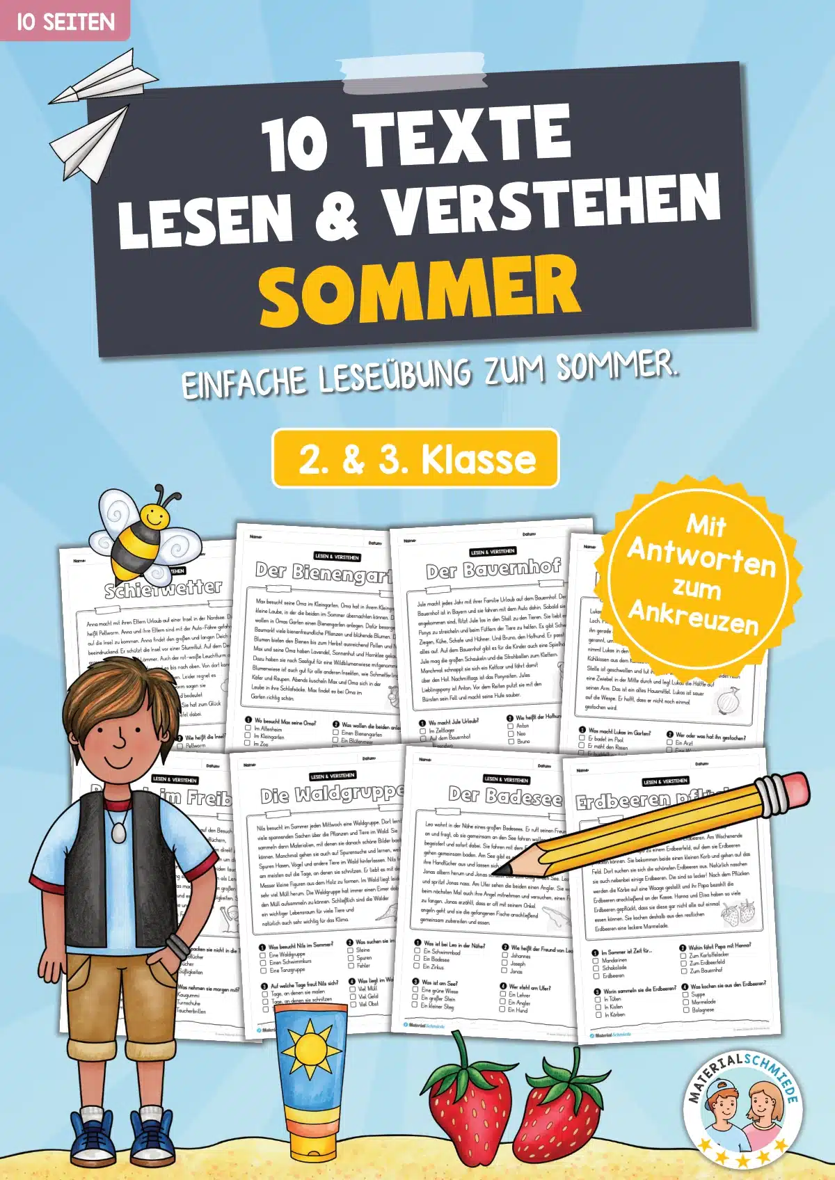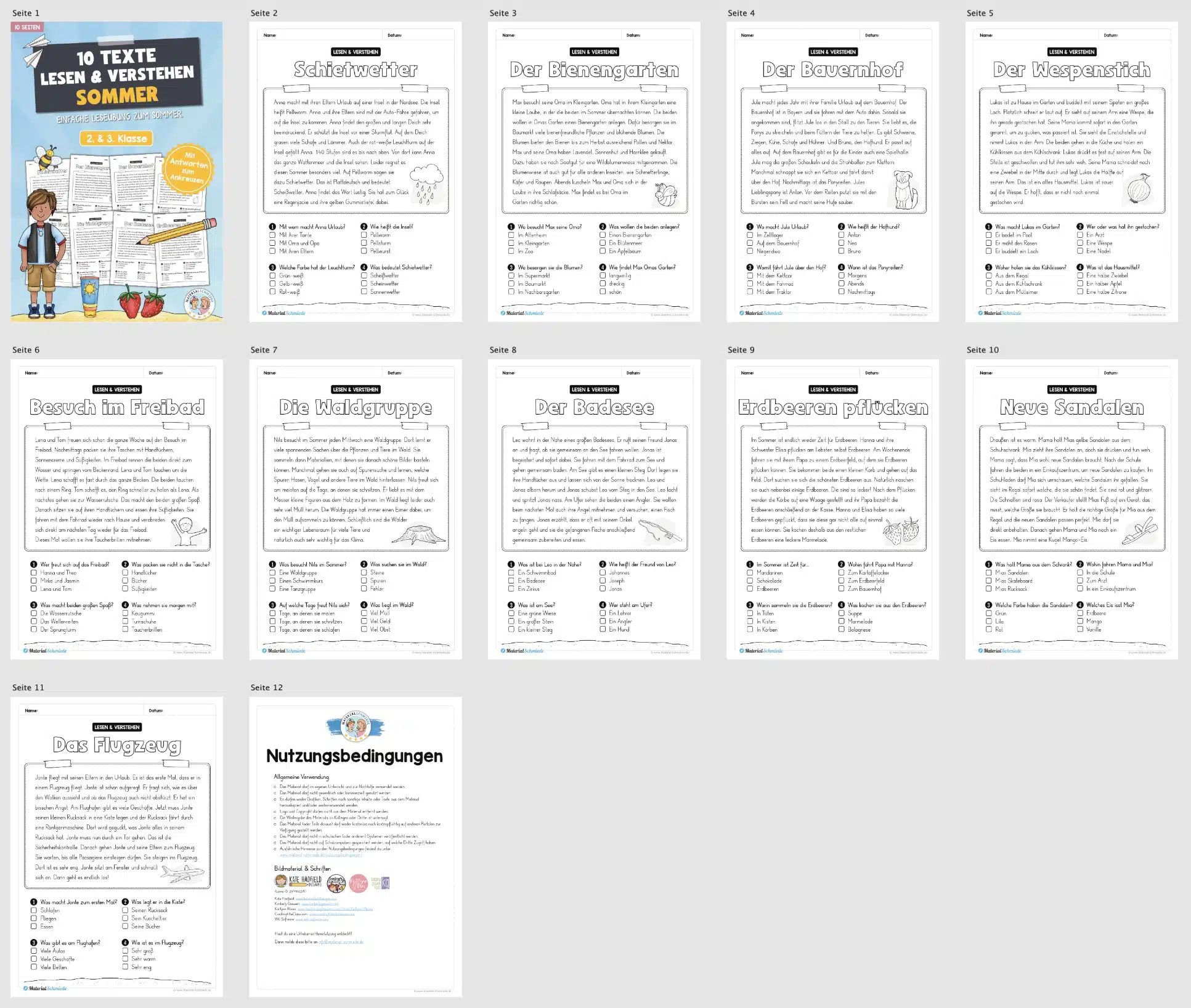 Hier findet ihr 10 Arbeitsblätter zum Lesen und Verstehen zum Thema Sommer mit Aufgaben zum Ankreuzen für die 2. & 3. Klasse im Deutschunterricht.