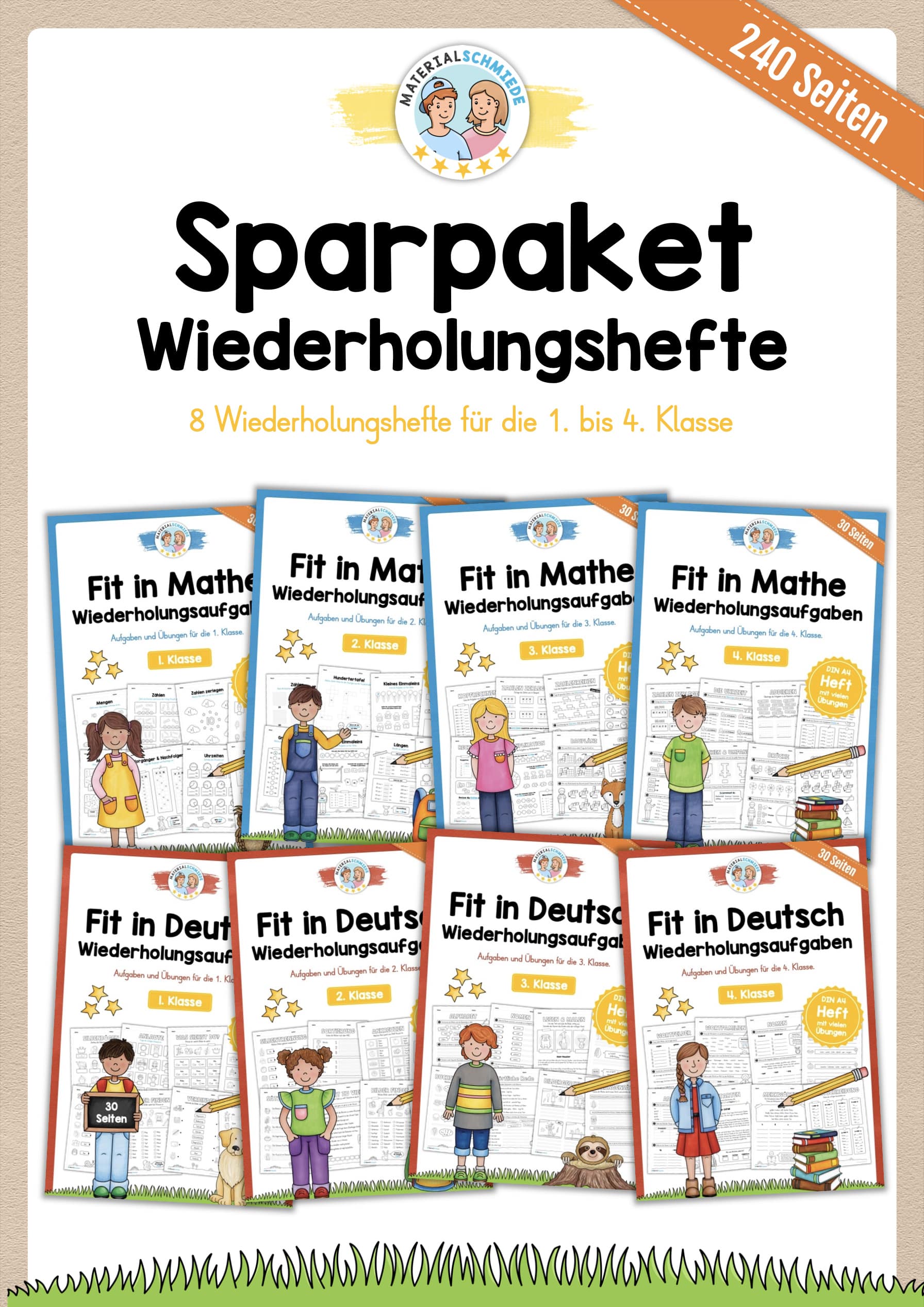 Unser Sparpaket mit den Deutsch & Mathe Wiederholungsheften für die 1. – 4. Klasse enthält insgesamt 240 Arbeitsblätter.