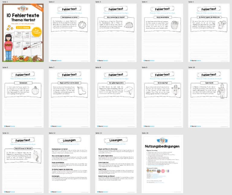 Die Schüler sollen in den vorgegebenen Texten jeweils 10 Fehler finden, die markieren und den Text richtig abschreiben. Die Fehlertexte sind dabei extra einfach gehalten, sodass diese sich für die 2. – 4. Klasse eignen (je nach Niveau der Schüler).