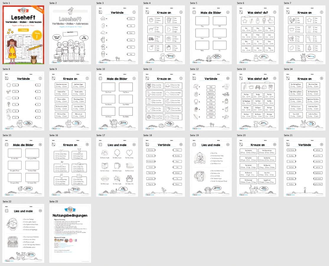 Dieses Leseheft beinhaltet 20 Arbeitsblätter für die 1. Klasse, in dem es um das Verbinden, Malen und Ankreuzen geht in der Stufe 1.