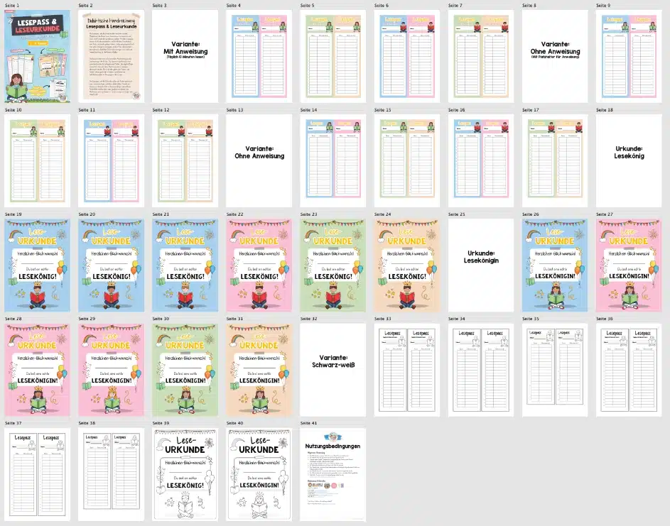 Wir haben verschiedene Varianten erstellt. So könnt ihr beim Lesepass die Vorlage mit den „10 Minuten lesen“ nutzen, selbst eine Anweisung eintragen (hierfür ist in einer Zeile Platz gelassen) oder die Variante ohne Anweisung verwenden. Für die Leseurkunden findet ihr Vorlagen für den Lesekönig und die Lesekönigin – jeweils in verschiedenen Farben. Und das ganze dann noch einmal in schwarz-weiß.