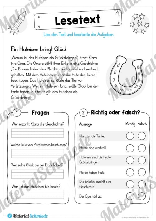 Die Kinder sollen sich jeweils einen Text durchlesen. Anschließend wird das Leseverständnis auf zwei verschiedene Arten abgefragt. Zum einen sollen die Kinder ein Wort zu einer Frage aufschreiben, zum anderen Aussagen mit richtig oder falsch beantworten (ankreuzen). Auf dem PDF sind insgesamt 10 Lesetexte rund um Silvester / Das neue Jahr vorhanden.