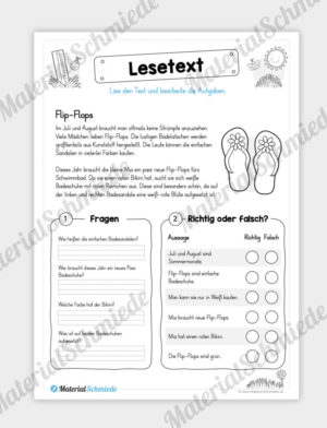 Die Kinder sollen sich jeweils einen Text durchlesen. Anschließend wird das Leseverständnis auf zwei verschiedene Arten abgefragt. Zum einen sollen die Kinder ein Wort zu einer Frage aufschreiben, zum anderen Aussagen mit richtig oder falsch beantworten (ankreuzen). Auf dem PDF sind insgesamt 10 Lesetexte rund um das Thema Sommer vorhanden.