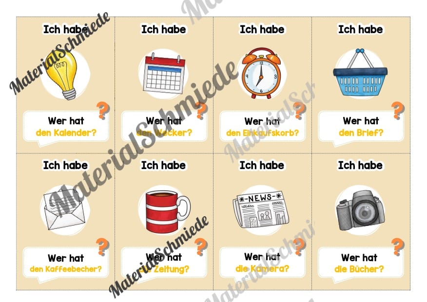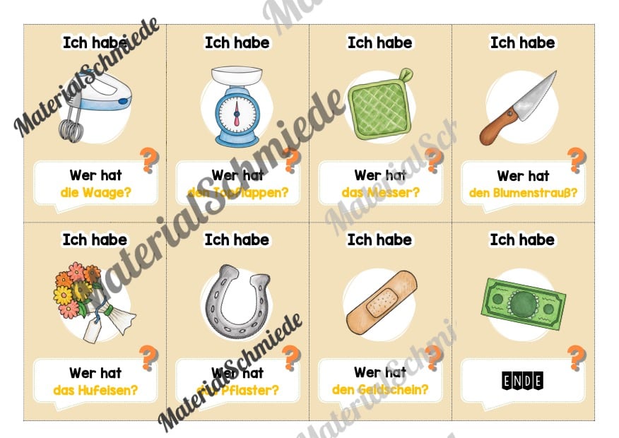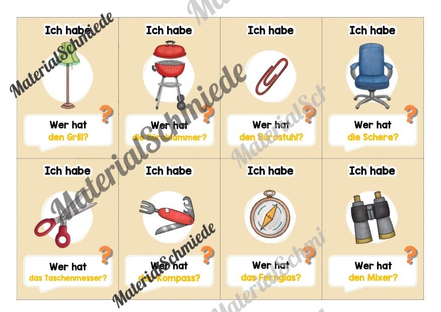 Auf einer Karte steht eine Frage mit „Wer hat…“. Zum Beispiel: „Wer hat den Karton?“. Das Kind, welches die Karte mit dem Karton hat, muss nun vorlesen: „Ich habe den Karton.“. Unter der Abbildung auf der Karte steht die nächste Frage mit z.B. „Wer hat das Fernglas?“. Dieses Prinzip zieht sich durch 40 Karten und übt das Lesen lernen auf spielerische Art und Weise.