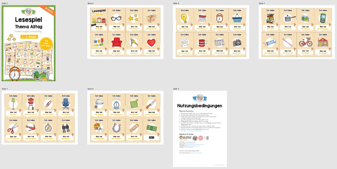 Hier findet ihr ein Lesespiel zum Thema Alltag mit 40 Karten.