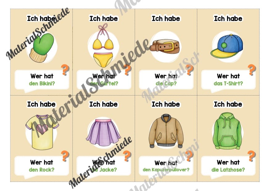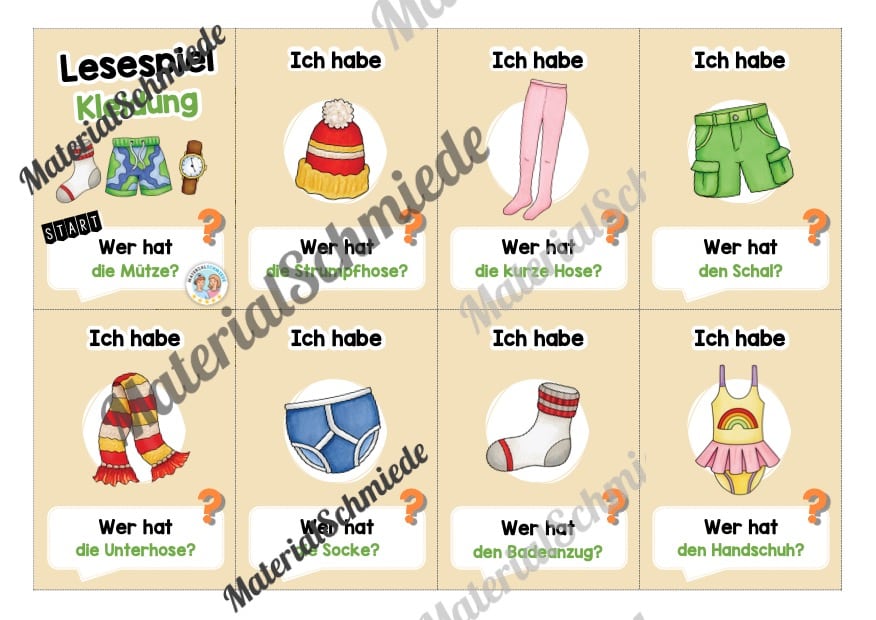Hier findet ihr ein Lesespiel zum Thema Kleidung mit 32 Karten.