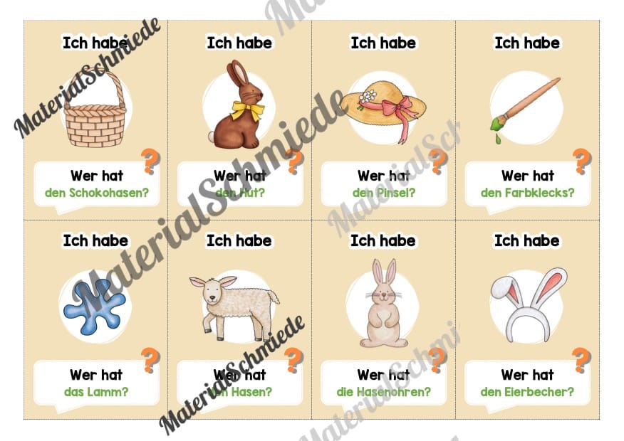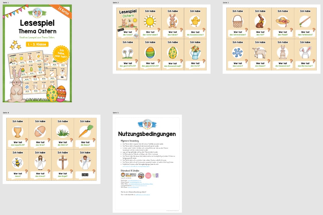 Auf einer Karte steht eine Frage mit „Wer hat…“. Zum Beispiel: „Wer hat den Osterhasen?“. Das Kind, welches die Karte mit dem Osterhasen hat, muss nun vorlesen: „Ich habe den Osterhasen.“. Unter der Abbildung auf der Karte steht die nächste Frage mit z.B. „Wer hat das gepunktete Ei?“. Dieses Prinzip zieht sich durch 24 Karten und übt das Lesen lernen auf spielerische Art und Weise.