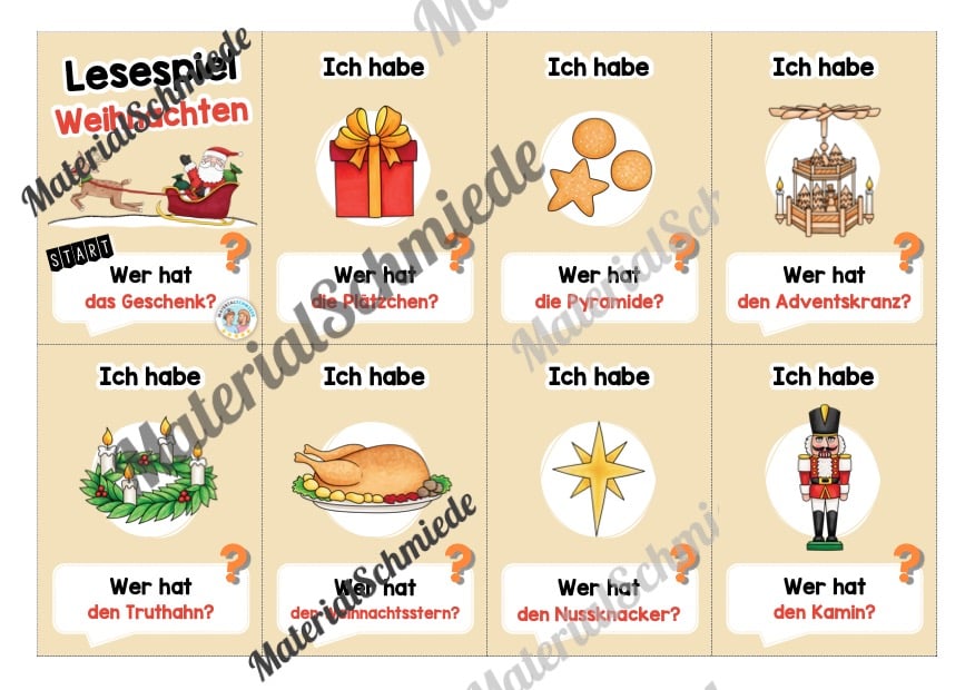 Auf einer Karte steht eine Frage mit „Wer hat…“. Zum Beispiel: „Wer hat den Weihnachtsmann?“. Das Kind, welches die Karte mit dem Weihnachtsmann hat, muss nun vorlesen: „Ich habe den Weihnachtsmann.“. Unter der Abbildung auf der Karte steht die nächste Frage mit z.B. „Wer hat das Geschenk?“. Dieses Prinzip zieht sich durch 32 Karten und übt das Lesen lernen auf spielerische Art und Weise.