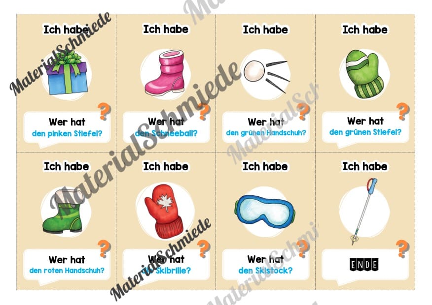 Auf einer Karte steht eine Frage mit „Wer hat…“. Zum Beispiel: „Wer hat den Handschuh?“. Das Kind, welches die Karte mit dem Handschuh hat, muss nun vorlesen: „Ich habe den Handschuh.“. Unter der Abbildung auf der Karte steht die nächste Frage mit z.B. „Wer hat den Schneeball?“. Dieses Prinzip zieht sich durch 32 Karten und übt das Lesen lernen auf spielerische Art und Weise.