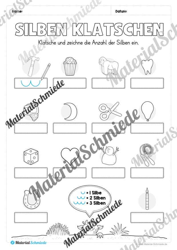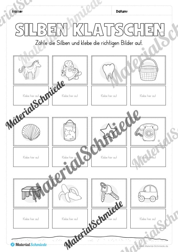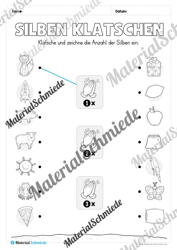 - Die Kinder benennen die Bilder, sprechen die Wörter laut und klatschen die Silben. Die Silbenbögen dienen dabei als visuelle Unterstützung.