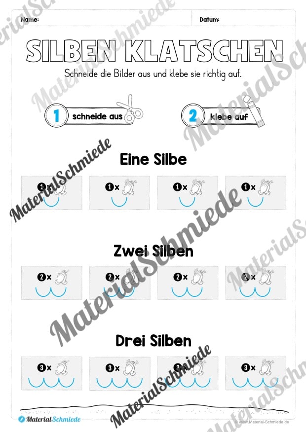 - In der abschließenden Aufgabe schneiden die Kinder Bilder aus und kleben sie entsprechend der Silbenanzahl in die richtigen Bereiche. Diese handlungsorientierte Aufgabe bietet eine zusätzliche Motivation und spricht weitere Lernkanäle an.
