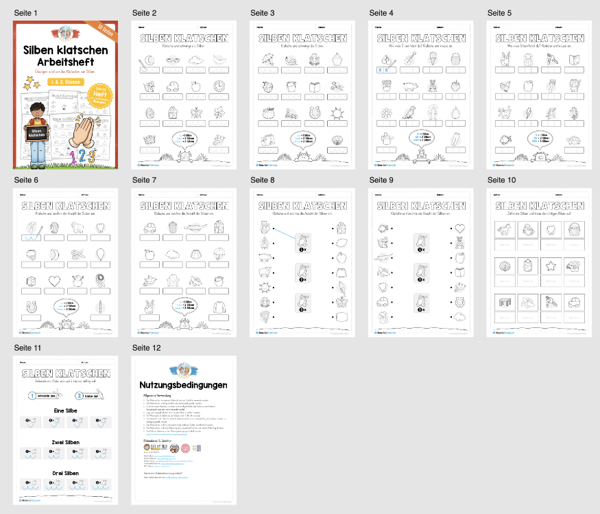 Das Heft umfasst verschiedene Übungsformate rund um das Silbenklatschen. Die Aufgaben sind bewusst doppelt angelegt, sodass die Kinder die gleiche Übung mehrfach durchführen können. Diese Wiederholung hilft dabei, Sicherheit zu gewinnen und das Gelernte zu festigen.