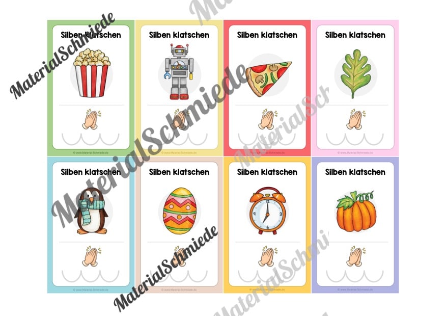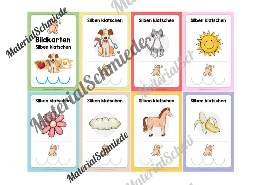 Das Material umfasst insgesamt 56 Bildkarten (7 Arbeitsblätter mit je 8 Karten). Jede Karte zeigt ein Bild, das ein Wort mit 1 bis 3 Silben darstellt. Die Kinder benennen die Bilder, sprechen die Wörter laut und klatschen dazu die Silben.
