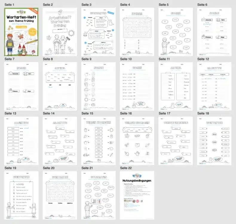 Dieses Arbeitsheft enthält insgesamt 20 Arbeitsblätter zum Thema Wortarten, bei denen sich alles um den Frühling dreht.