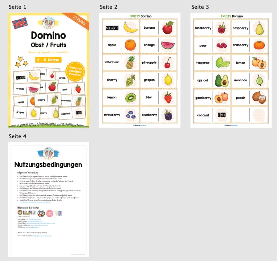 Je nach Niveau der Schüler, eignet sich das Domino zum Obst (Fruits) auf Englisch für die 2. bis 5. Klasse.