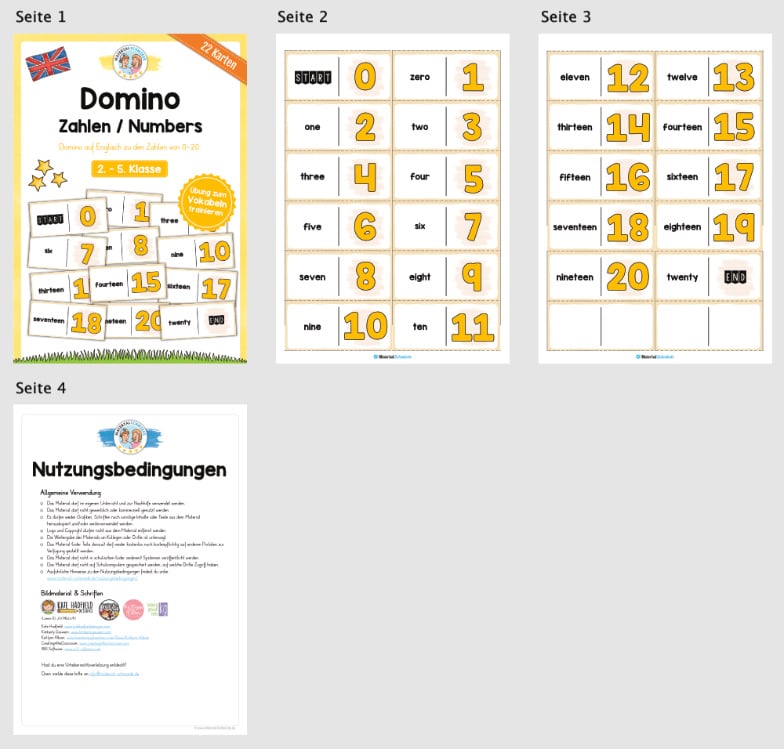 Je nach Niveau der Schüler, eignet sich das Domino zu den Zahlen (Numbers) auf Englisch für die 2. bis 5. Klasse.
