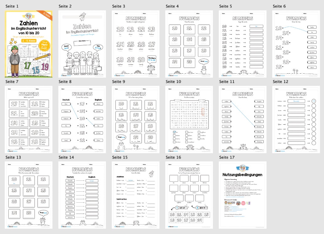 Hier findet ihr ein Materialpaket rund um das Thema Zahlen (Numbers) für den Englischunterricht mit insgesamt 13 Arbeitsblättern. Dabei geht es in diesem Materialpaket um die Zahlen von 10 bis 20.