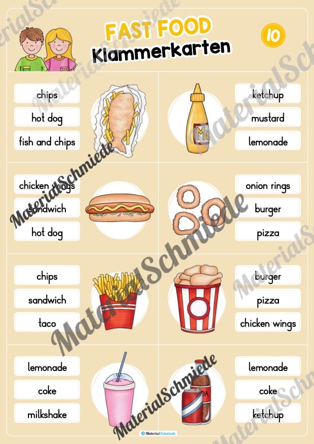 Je nach Niveau der Schüler, eignen sich die Klammerkarten rund um das Fast Food auf Englisch für die 3. bis 5. Klasse.
