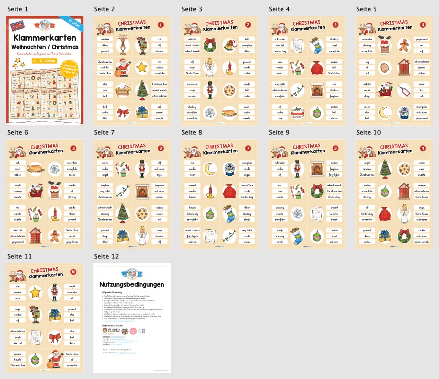Je nach Niveau der Schüler, eignen sich die Klammerkarten rund um die Weihnachten (Christmas) auf Englisch für die 3. bis 5. Klasse.