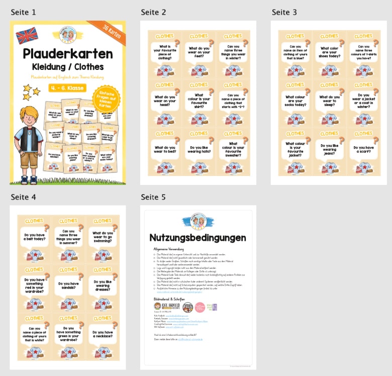 Mit Hilfe der Plauderkarten können die Kinder Vokabeln zum Thema Kleidung / Clothes trainieren.