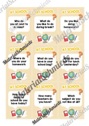 Auf jeder der 36 Karten finden die Schüler eine Frage vor, welche etwas mit dem Thema Schule zu tun hat. Ein Schüler liest eine Frage vor, sein Tischnachbar muss die Frage beantworten. Die Gruppen können natürlich auch vergrößert werden, so dass z.B. ein Schüler immer die Fragen vorliest und drei weitere Kinder die Fragen der Reihe nach beantworten.