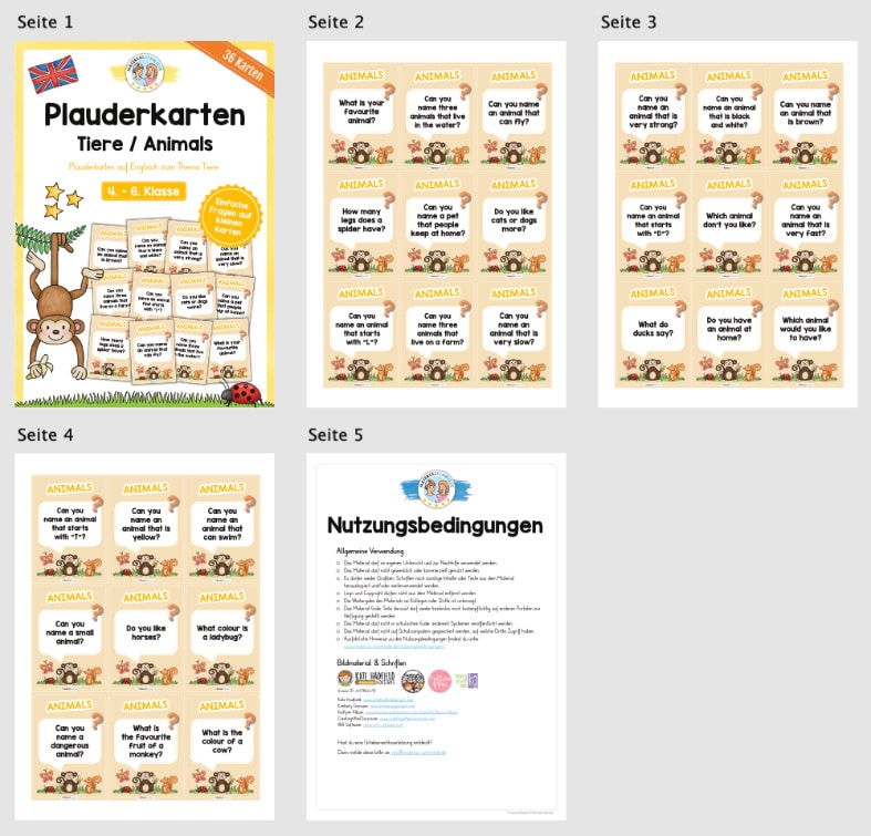 Je nach Niveau der Schüler, eignen sich die Plauderkarten zu den Tieren (Animals) auf Englisch für die 4. bis 6. Klasse. Zwar sind die Fragen relativ einfach gehalten, jedoch wird ein gewisser Wortschatz vorausgesetzt, um die Fragen verstehen und beantworten zu können.