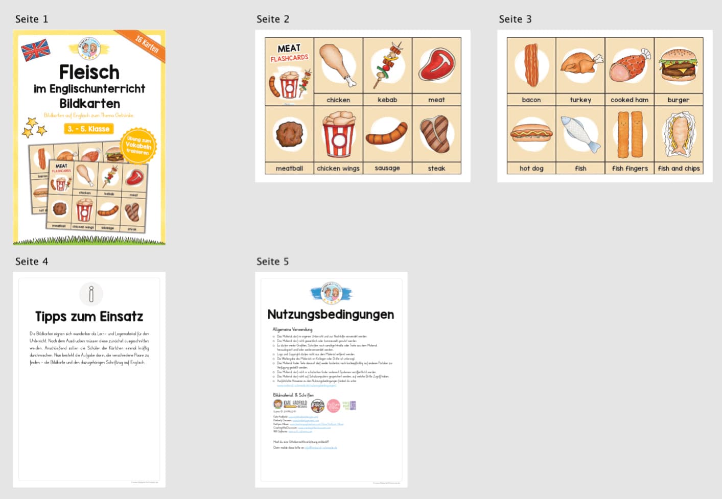 Hier findet ihr 16 Bildkarten zum Thema Fleisch / Meat auf Englisch. Mit Hilfe der Bildkarten können die Schüler die einzelnen Vokabeln zum Fleisch und Fisch auf Englisch näher kennenlernen.