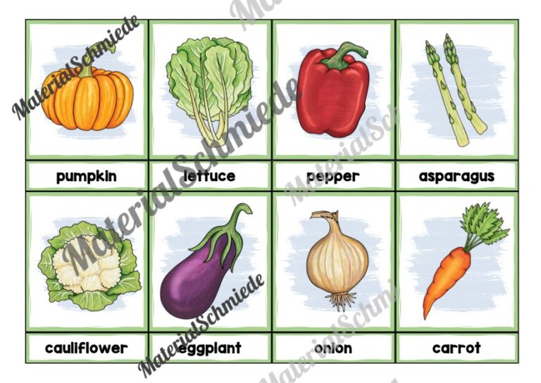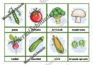 Hier findet ihr 23 Bildkarten zum Thema Gemüse / Vegetables auf Englisch. Mit Hilfe der Bildkarten können die Schüler die einzelnen Gemüsesorten auf Englisch näher kennenlernen.