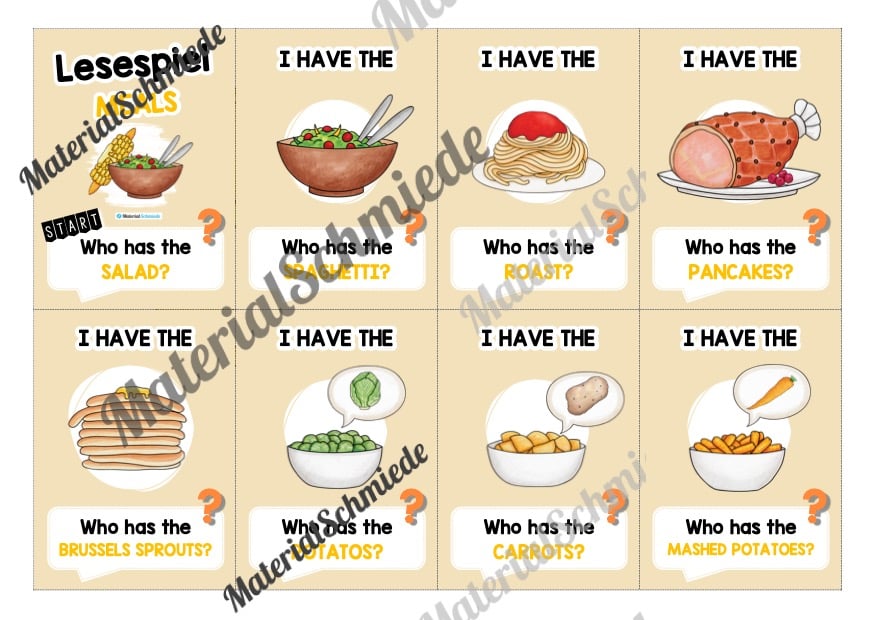 Auf einer Karte steht eine Frage mit „Who has…“. Zum Beispiel: „Who has the salad?“. Das Kind, welches die Karte mit dem Salat hat, muss nun vorlesen: „I have the salad“. Unter der Abbildung auf der Karte steht die nächste Frage mit z.B. „Who has the roast?“. Dieses Prinzip zieht sich durch 16 Karten und übt das Lesen lernen sowie die Vokabeln der Gerichte / Meals auf Englisch auf spielerische Art und Weise.