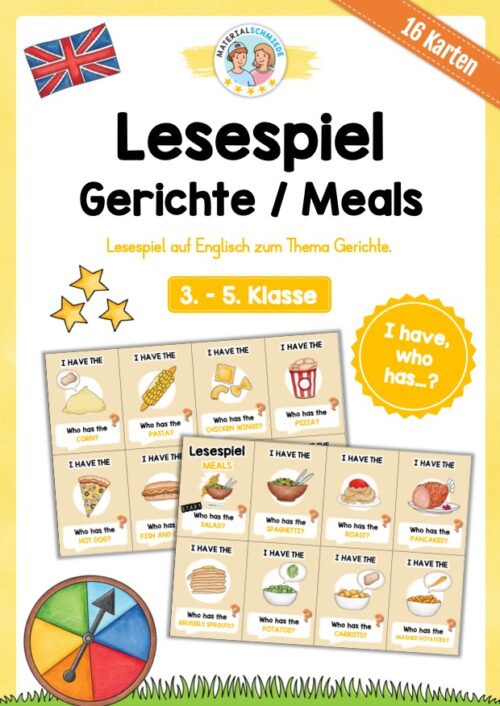 Je nach Niveau der Schüler, eignet sich das Lesespiel zu den Gerichten (Meals) auf Englisch für 3. bis 5. Klasse.