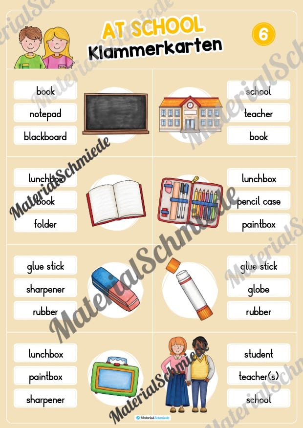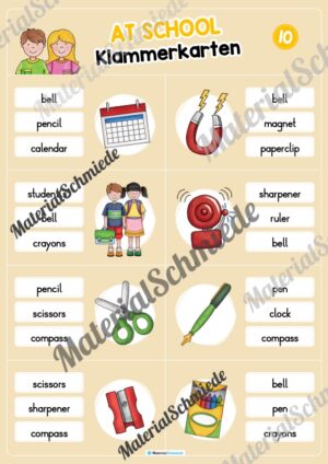 Mit Hilfe der Klammerkarten können die Kinder Vokabeln zum Thema Schule / At school trainieren.