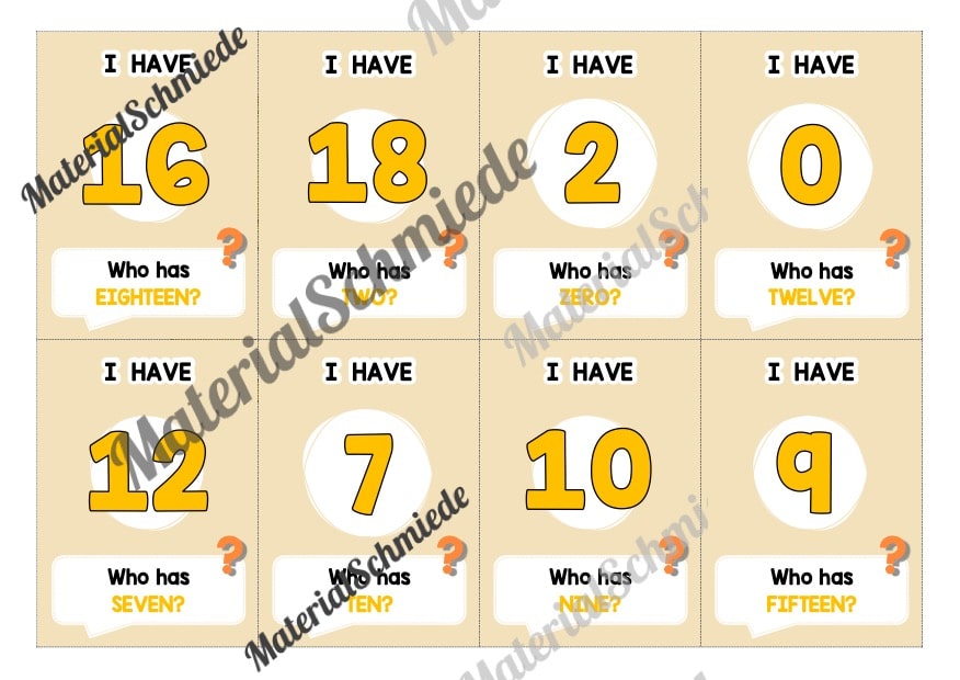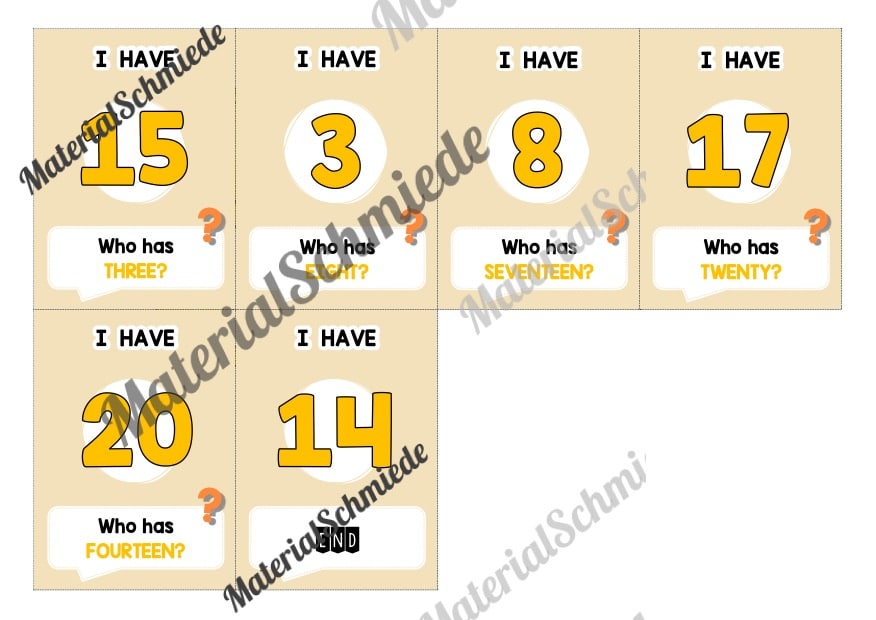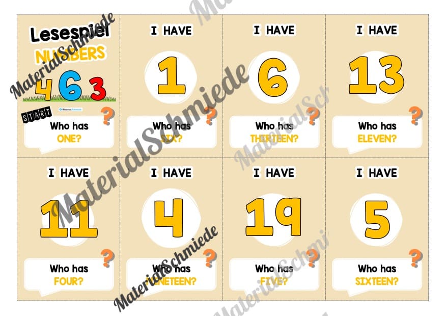 Auf einer Karte steht eine Frage mit „Who has…“. Zum Beispiel: „Who has the THREE?“. Das Kind, welches die Karte mit der Drei hat, muss nun vorlesen: „I have THREE“. Unter der Abbildung auf der Karte steht die nächste Frage mit z.B. „Who has the TEN?“. Dieses Prinzip zieht sich durch 22 Karten und übt das Lesen lernen sowie die Vokabeln der Zahlen auf Englisch auf spielerische Art und Weise.