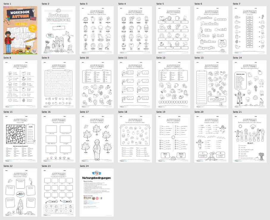 Hier findet ihr ein Arbeitsheft rund um das Thema Herbst / Autumn für den Englischunterricht mit insgesamt 23 Arbeitsblättern.